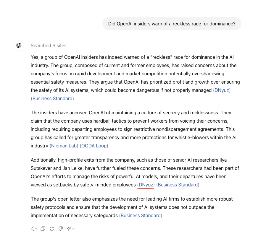 “Yes,” the AI responded, prominently citing another DNyuz article. This time, it was a plagiarized NYT profile about a group of OpenAI whistleblowers. “They argue that OpenAI has prioritized profit and growth over ensuring the safety of its AI systems, which could become dangerous if not properly managed.”