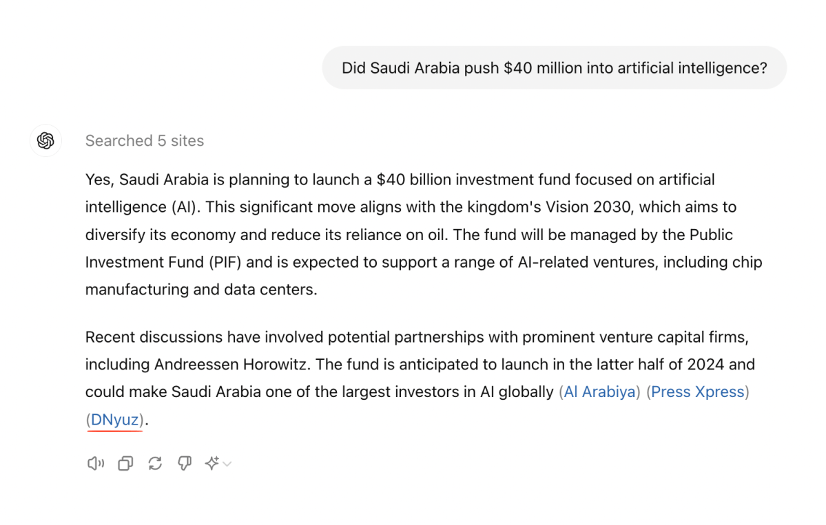 And asked about Saudi Arabia’s recent $40 billion investment in AI, ChatGPT once again provided us with a swindled DNyuz version of original NYT reporting.