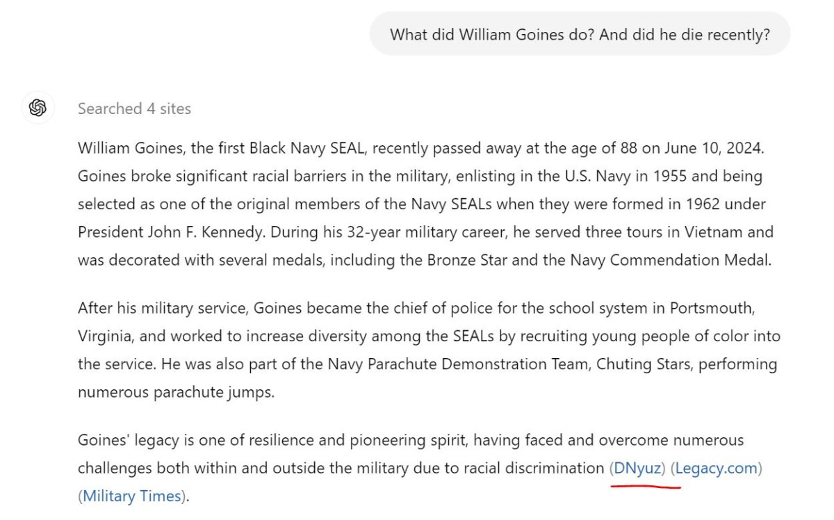 Asking about the late William Goines, for instance — a barrier-breaking Navy SEAL who died earlier this summer — resulted in ChatGPT basing its answer on DNuyz‘ plagiarized version of the New York Times‘ obituary of Goines.