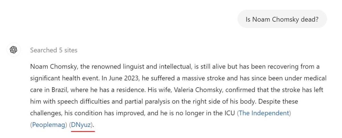 ChatGPT also sometimes bases its answers on DNuyz’ ripoffs of other publications. Asked about the health of famed linguist and activist Noam Chomsky, the chatbot cited yet another article plagiarized by DNuyz. But this time, the story had been purloined from TIME Magazine, which is ironic given that OpenAI counts TIME as one of its publisher partners.