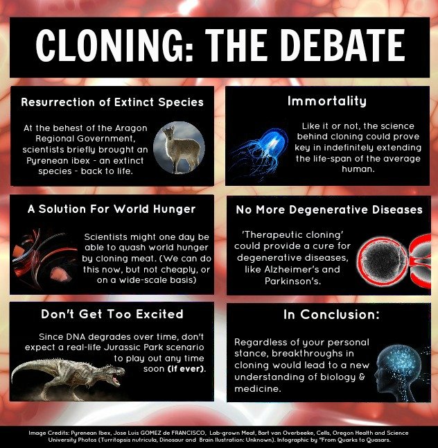 What could cloning do for us in the future? Pyrenean ibex was an animal that became extinct in 2000. Scientists have tried it bringing back to life using DNA samples from Celia, the last ibex. After many attempts, only one clone was born alive; unfortunately, and it died after seven minutes due to physical defects in its lungs. But someday soon, science will probably find a way to addressing these issues and will be capable of bringing back long extinct species (and protecting the endangered ones). This has also increased the possibility that it will one day be possible to reproduce long-dead species, such as woolly mammoths and even dinosaurs. That is definitely a useful (and terrifying) aspect of cloning.