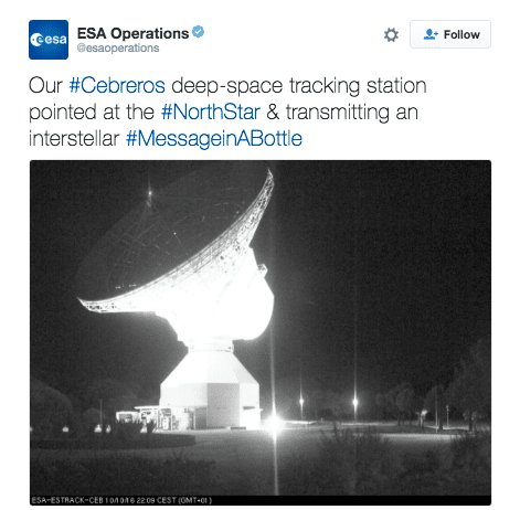 Messages answering the question “How will our present environmental interactions shape the future?” were collected from all over the world and converted into a 14-minute digital transmission, which has now been beamed to the North Star using the ESA’s powerful radio telescope in Cebreros.