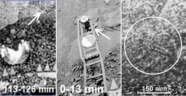 Of the images, he asserts, “On the first image (7 min), on the ejected soil is a shallow oblong groove visible, with its length about 100 mm. In the second image (20 min) sides of the grooves are raised, and the length increased to about 150 mm. The orientation of the grooves is the same as that of the ‘scorpion’. In the picture of the 59th min a part of the regular structure of the ‘scorpion’ appeared…On the 93rd minute, the ‘scorpion’, apparently, recovered completely from the soil that filled it, that was consisting a layer probably not exceeding a 1–2 cm. Thus, the rescue operation of the object took about 1.5 hr. One can assume that this indicates its limited physical abilities. On the 119th min it was no longer visible.”