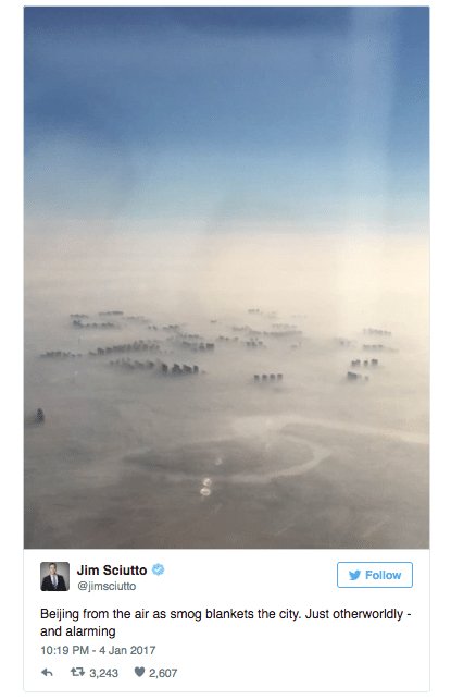 On the first day of 2017, heavy smog rolled into major Chinese cities disrupting the usual bustle of the world’s biggest industrial nations. CNN chief national security correspondent Jim Sciutto captures an aerial shot of China enveloped in thick, toxic smog.