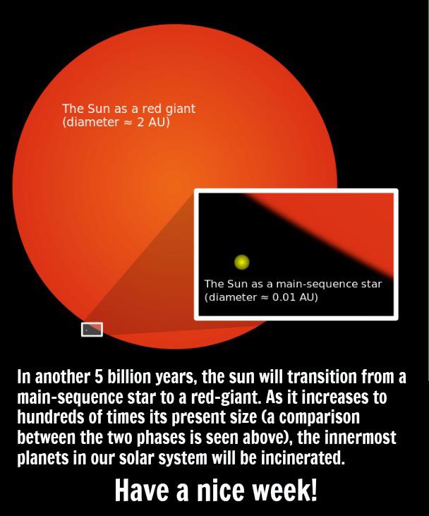 “In another 5 billion years, the sun will transition from a main-sequence star to a red-giant. As it increases to hundreds of times its present size (a comparison between the two phases is seen above), the innermost planets in our solar system will be incinerated.”