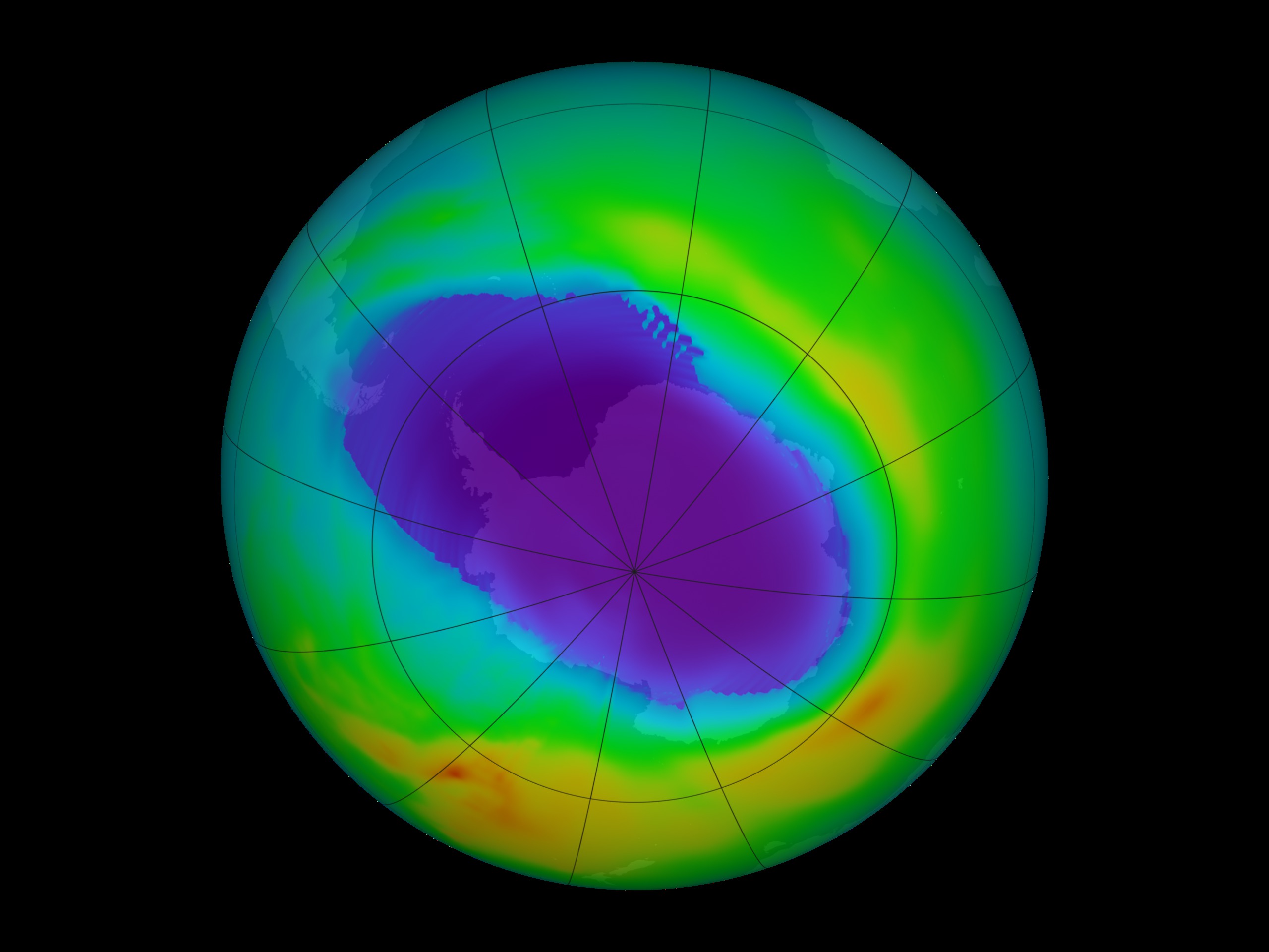 Every September, the Antarctic ozone hole forms after rays from the Sun catalyze ozone destruction cycles. These cycles involve chlorine and bromine, which mostly come from chlorine-containing human-made chemicals called chlorofluorocarbons (CFCs), which were banned in 1996.