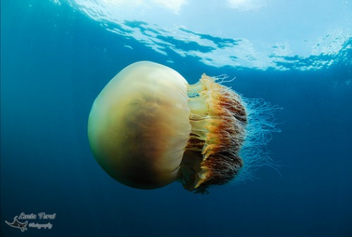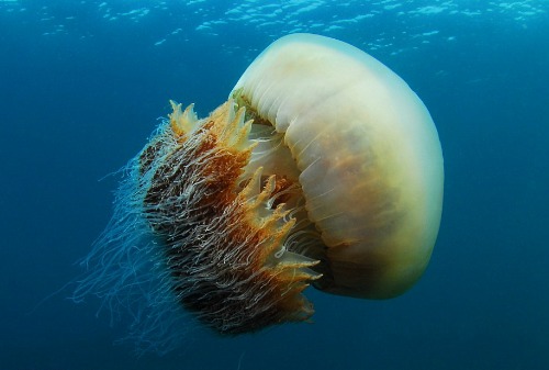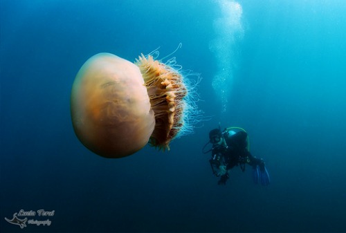 Recently, a Brazilian photographer scuba dived off the coast of Fukui province, Japan, and captured these stunning images of the creature in its natural habitat. This particular specimen is believed to be about 5 feet wide: about a hundred times larger than the average jellyfish.