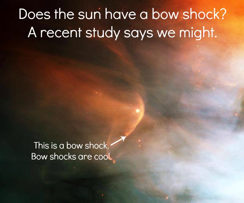 Fortunately, science is to the rescue and the sun may yet produce a bow shock. It won’t be as cool, defined, and dynamic as the bow shock seen in the pictured star from the Orion nebula, but hey, we must compromise. A bow shock is best visualized as a sonic boom from a jet, but more accurately thought of as the bow wave created by boats as they pass through water. Due to pressures caused by the interstellar medium against the outer layers of the heliosphere, you get this shockwave to form.