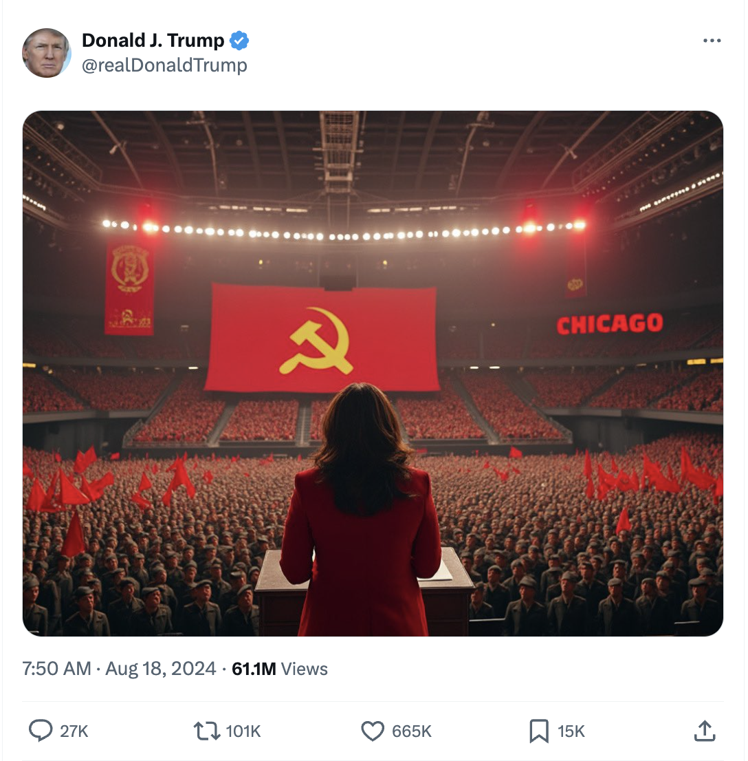Early Sunday morning, former president Donald Trump took to X-formerly-Twitter to share an AI-generated image of vice president Kamala Harris wearing a red suit and facing a packed arena of faceless figures who all appear to be decked in Soviet-era military garb. Some members of the fake crowd are pictured flying red flags, while a massive, unfurled banner hanging above the arena depicts a communist hammer and sickle symbol. To the right of that banner, a red-lettered neon sign simply reads: “CHICAGO.”