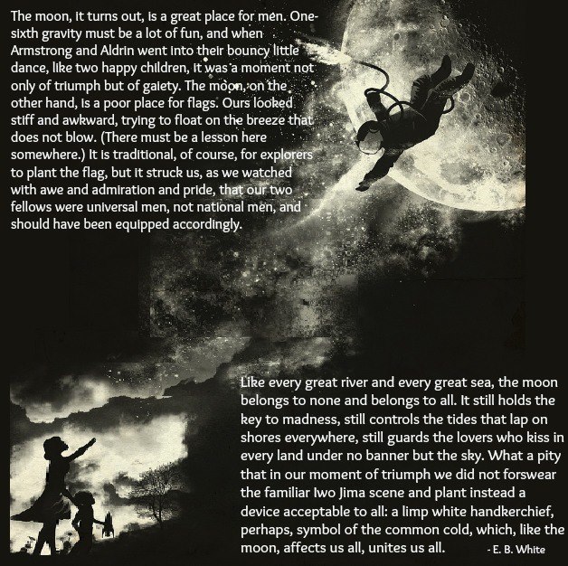 “The moon, it turns out, is a great place for men. One-sixth gravity must be a lot of fun, and when Armstrong and Aldrin went into their bouncy little dance, like two happy children, it was a moment not only of triumph but of gaiety. The moon on the other hand, is a poor place for flags. Ours looked stiff and awkward, trying to float on the breeze that does not blow. (There must be a lesson here somewhere.) It is traditional, of course, for explorers to plant the flag, but it struck us, as we watched with awe and admiration and pride, that our two fellows were universal men, not national men, and should have been equipped accordingly.