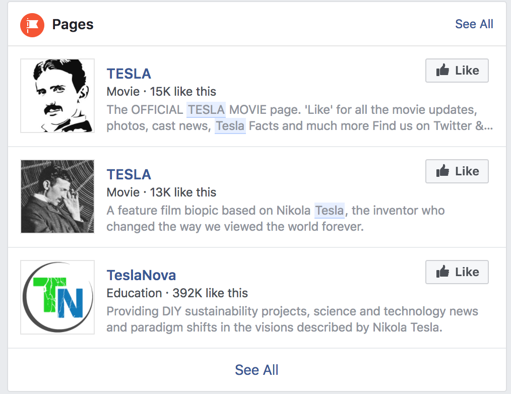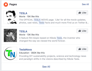 Indeed, Musk seems to have lived up to his promise. Searching for Tesla on Facebook now reveals just lame stuff about the scientist: