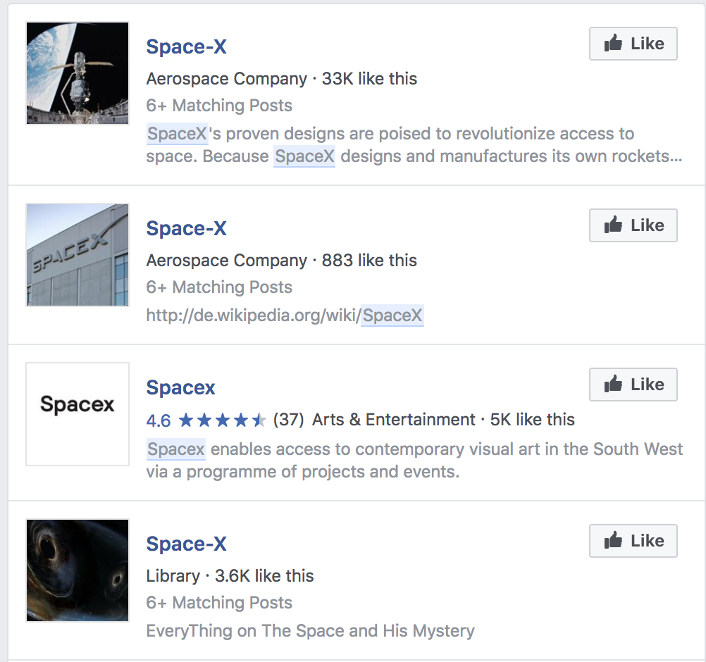 And a search for SpaceX reveals a number of pages, though none seems to be official: