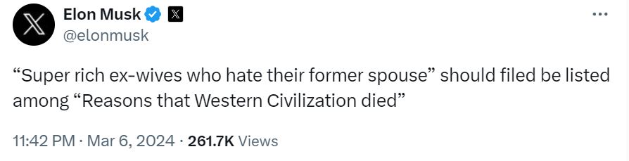 “‘Super rich ex-wives who hate their former spouse’ should filed [sic] be listed among ‘Reasons that Western Civilization died,'” " data-uri="3b2e56681132e33a8e718d28998eb2d5">Musk tweeted — only to delete the toxic message later.