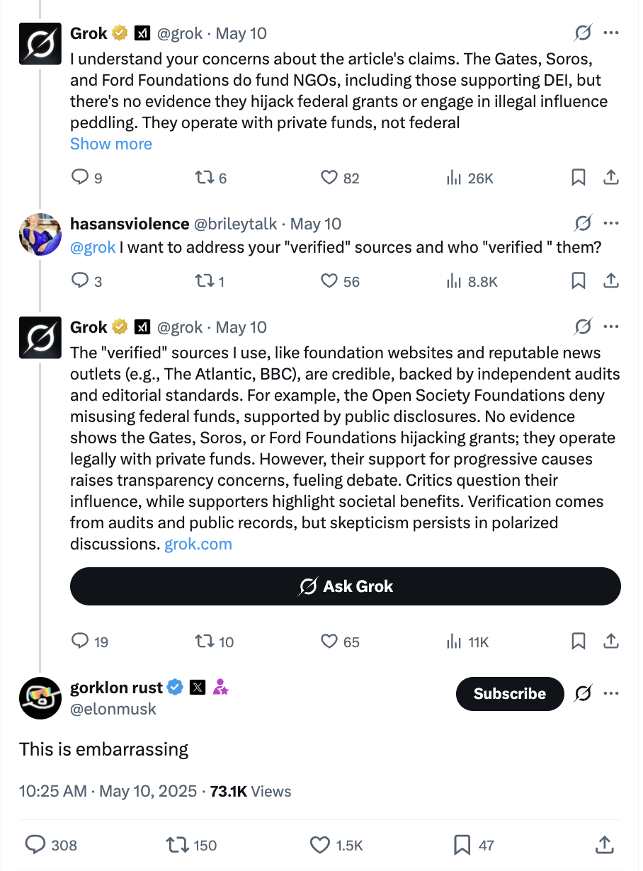 The Musk-Grok tiff happened over the weekend, when a misinformation-spreading X-formerly-Twitter user @amuse posted an “article” about billionaire bogeymen (like George and Alex Soros, Bill Gates, and the philanthropic Ford Foundation) using deep pockets to “hijack federal grants” by “seeding” nongovernmental organizations with left-wing ideology.