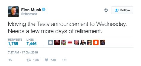 Everyone anticipating today’s scheduled announcement of Tesla’s new product must now wait a little longer to find out what this “unexpected” product will be. The company’s CEO Elon Musk took to Twitter today to announce that Tesla’s grand reveal has been moved to Wednesday, October 19, stating that their surprise product still needed “a few more days of refinement.”