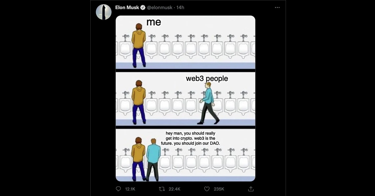 Friday evening, around 8:30 pm ET, the billionaire CEO took to Twitter to make fun of “decentralized autonomous organization” (DAO) and Web3 lovers, portraying them as evangelists who even pitched the blockchain gospel to urinal neighbors.