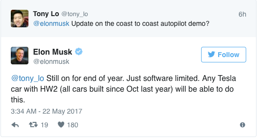 He said that the coast-to-coast test is still on track to take place at the end of the year, and that all Tesla cars built since October 2016 would be updated. The plan, announced in a Ted Talk last month, is to “go all the way from a parking lot in California to a parking lot in New York with no controls touched in the entire journey.”