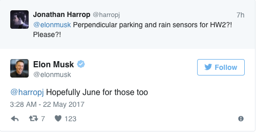 The speed limit on the vehicles was limited to 145 km per hour (90 mph) on highways and no more than 8 km per hour (5 mph) over the speed limit when off highway. In addition to this, the new update should feature a perpendicular parking capability and auto windshield-wipers.