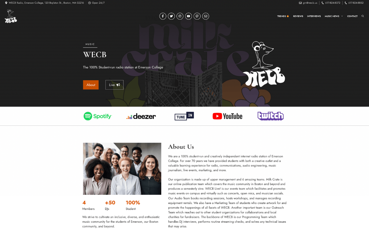 As we dug through the WECB.fm website, we were struck by the degree to which its owners sought to give it a surface-level veneer of credibility. Boasting an old WECB logo, it claims on its homepage to be the “100% student-run and creatively independent internet radio station of Emerson College,” and even lists Emerson College’s correct address and phone number. It even still links to the actual WECB radio stream.