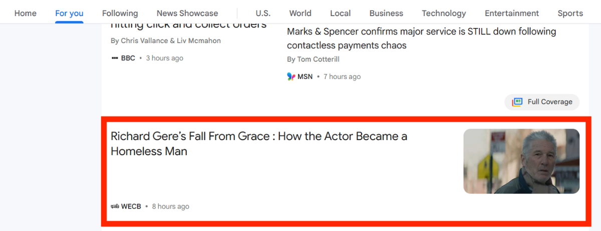 The allegedly WECB-published article we caught cropping up in Google News, however, bungles virtually every aspect of the story. The mangling starts with the headline — “Richard Gere’s Fall From Grace : [sic] How the Actor Became a Homeless Man” — which suggests that Gere was legitimately homeless. The body of the article then contradicts the headline, erroneously claiming the Hollywood star spent time masquerading as a homeless man while preparing for his movie role. Which, again, was a random internet lie to begin with.