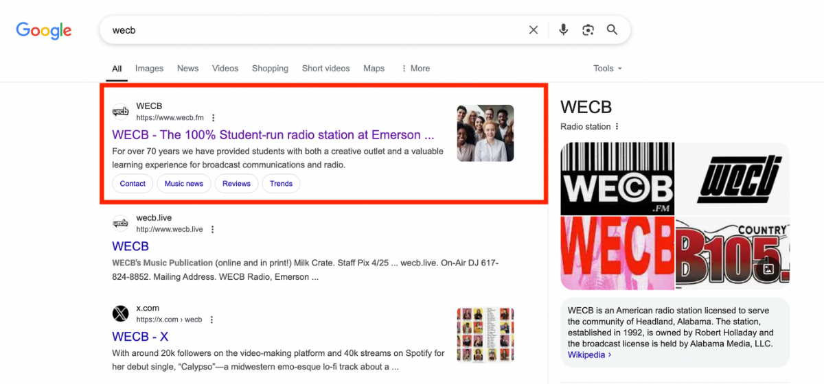The fake site still exists, but changed its URL to WECB.us following its manual Google demotion. As it stands, the sloperator behind the impersonator remains unclear. Interestingly, on the site’s contact page, an embedded Google Maps view of Emerson’s address and the surrounding area is in French. Vive la Boston!