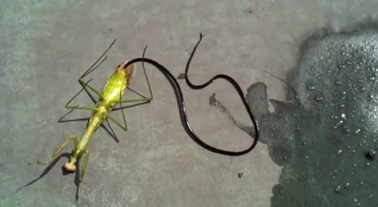 That’s exactly what happened to one man. The video surfaced back in May of 2014. It shows an individual killing a praying mantis, and then we see an alarmingly large parasite emerge.