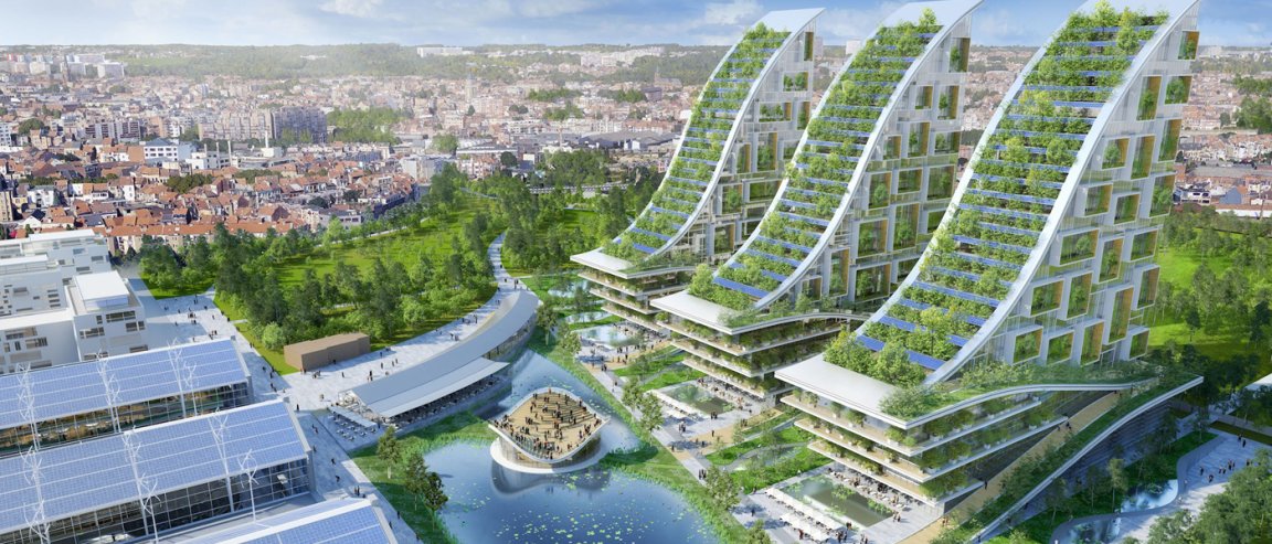 Once a port, then a warehouse, then a train and maritime station, Brussel’s now-abandoned Tour and Taxis site could soon be transformed into an impressive green haven featuring massive, 300-foot-tall structures partially powered by solar panels. The numerous plants that would be seamlessly integrated into the buildings would allow them to absorb 175 tons of carbon dioxide (CO2) annually.