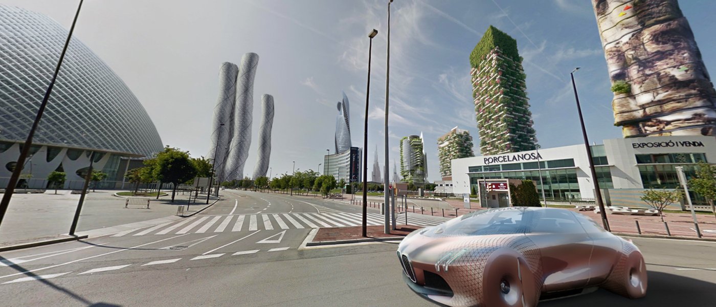 The interactive 3D globe has several interactive points in different colors. The gold points are fully interactive, allowing users to explore cities like New York, Chicago, Barcelona, Shanghai, and Dhaka in full 360-degree views that accommodate virtual reality. The white points provide predictions without visuals. Users can access the site for predictions ranging from 2030 all the way to 2050.