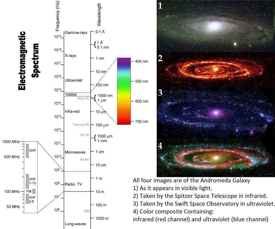- Images taken of parts of the electromagnetic spectrum invisible to the human eye. These frequencies are then mapped to the red, green, or blue color channels (as seen the pictures of Andromeda shown above).