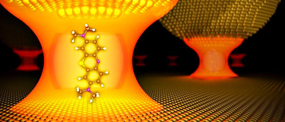 The trap, known as a ‘nanopore’ is a cavity that is a nanometer wide, only a billionth of a meter. It was formed between a tiny gold sphere and a gold film, basically a golden hall of mirrors. The film creates a mirror image of the sphere so that a molecule can be positioned in a certain way that ensures entrapment of an emitted photon. According to Hess, the cavity is small enough so that light doesn’t have a choice but to come together with matter.