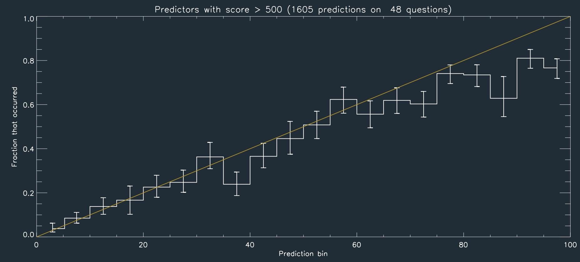 “Individuals outperform the community predictions on lots of individual questions, but in aggregate, you are better off trusting the community than nearly any individual,” Aguirre noted in a recent email exchange. “The aggregate predictions (by any aggregation method and including all predictors) are substantially more precise and well-calibrated than chance, [and] Metaculus users do quite a good job at making well-calibrated predictions, especially for low probabilities.”