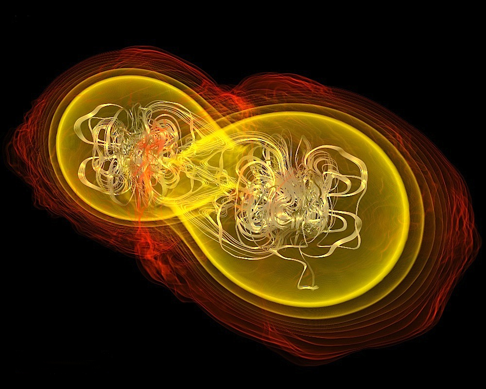So let’s take a 1.38 solar mass white dwarf and a 2.9 solar mass neutron star (just making guesstimate numbers). Both are situated in the middle of a beautiful planetary nebula. How close the two objects are determines if they’ll eventually merge. If they are far enough apart, they’ll continue orbiting one another. If they get too close, they’ll start losing angular momentum through gravitational waves (this is where the fun part comes in).