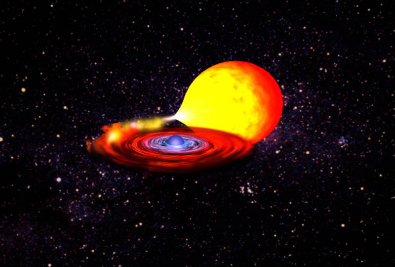 On average, a star will happily fuse away hydrogen into helium for about 90% of its lifetime. Our Sun for instance, it will remain on the main sequence for 10 billion years. Then it’ll begin helium burning, intermittent hydrogen and helium burning, this will last for a further billion years. Following this, for the first 10 million years of this binary system, nothing much will happen. They will remain orbiting one another, quite boring really. After this however, the more massive star will fall off the main sequence and begin helium burning, after that it’ll continue fusing more and more elements until it has an iron core. When the helium fusion stars, it has become a red supergiant.