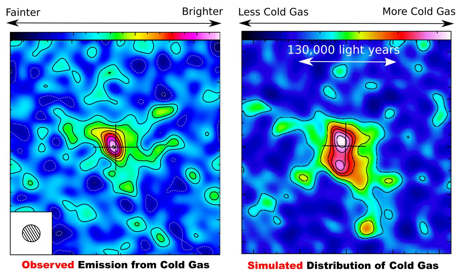 Using a combination of data gathered from powerful radio telescopes and supercomputer simulations, the teams found that a quasar spits out cold gas at speeds up to 2000 kilometres per second, and across distances of nearly 200,000 light years — much farther than has been observed before.