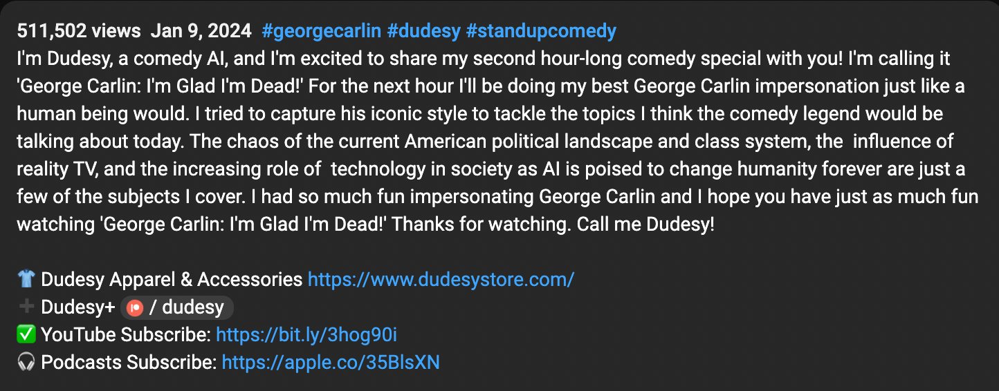 Earlier this month, an outfit called Dudesy AI posted an hour-long standup routine titled “George Carlin: I’m Glad I’m Dead.” Run by “Mad TV” alum Will Sasso and podcaster Chad Kultgen, the duo claim they trained AI models on the comic’s huge body of recorded work — though Ars Technica has cast doubt on that assertion — and in doing so, drew the wrath of Carlin’s estate, which didn’t approve any such use.