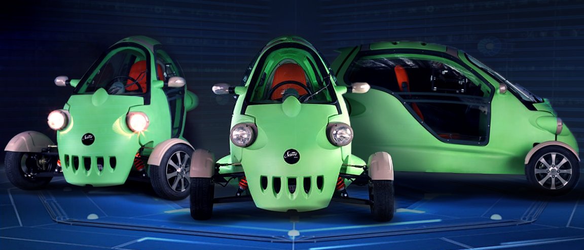 These weird looking compact EVs have folding gull-wing doors, a steel chassis, and a fully recyclable polyethylene body. Under the hood, the SAM is powered by a lithium-polymer battery pack that has a five-hour charging time using a regular outlet. That charge will last the EV 80 to 100 km (50 to 62 miles), and it has a top speed of 90 kmh (56 mph).