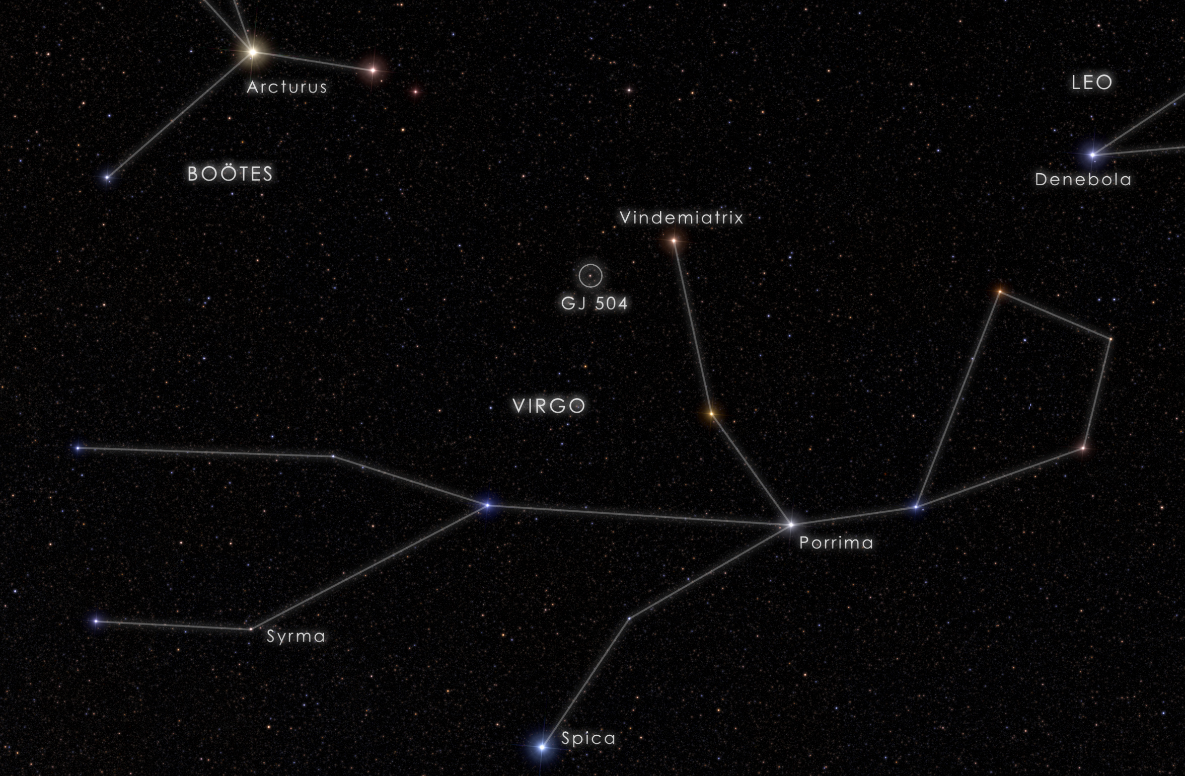 59 Virginis is a G-type main-sequence star located in the constellation Virgo. Discovered around 1538, the star can be seen with the naked eye in most places around Earth. Since the star goes by many names (59 Virginis, e Virginis, HR 5011, etc) we’ll be referring to it as GJ 504.