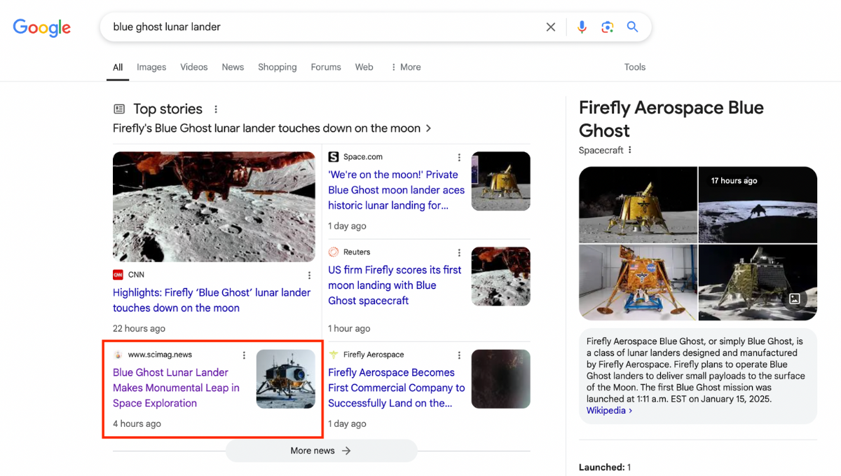 These are just two of several Science Magazine articles we found occupying coveted Google positions. A search for “Blue Ghost lunar lander,” for example, referencing the US-based aerospace firm Firefly’s successful landing of its historic lunar spacecraft, included more Science Magazine slop — including a fake image of a nonexistent version of the lander! — in Google’s Top Stories, where it ranked alongside real journalism from CNN, Space.com, and Reuters.