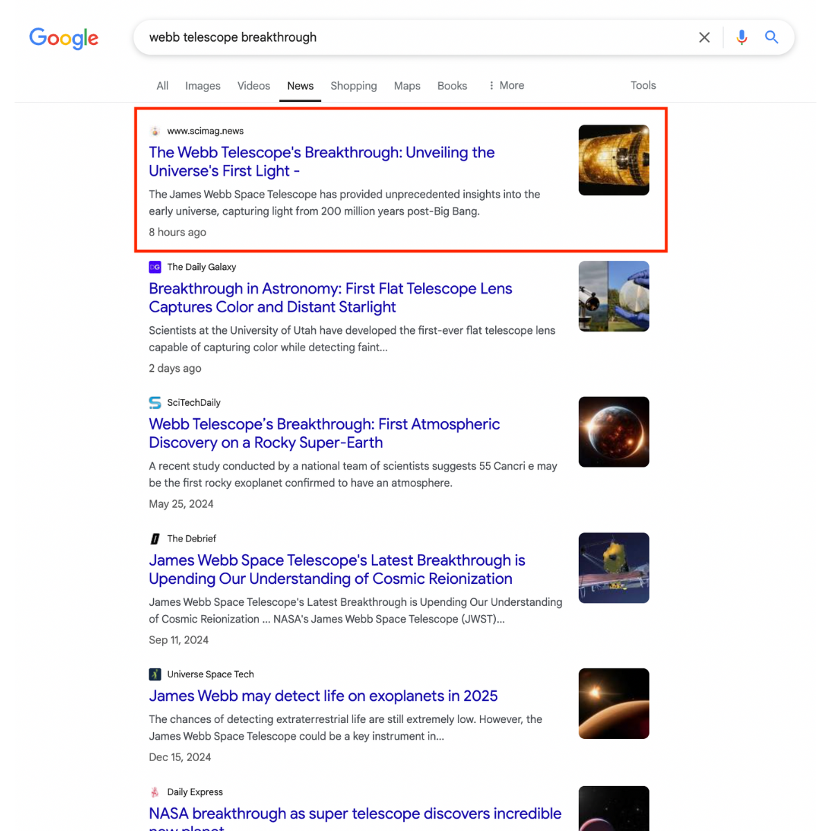 A search for “Webb Telescope breakthrough” saw more Science Magazine slop snag the very top result in the News tab. Though the groundbreaking James Webb Space Telescope (JWST) has captured many real and mindblowing images of our awe-inspiring cosmos, the article instead includes a strange, AI-generated rendition of the JWST.