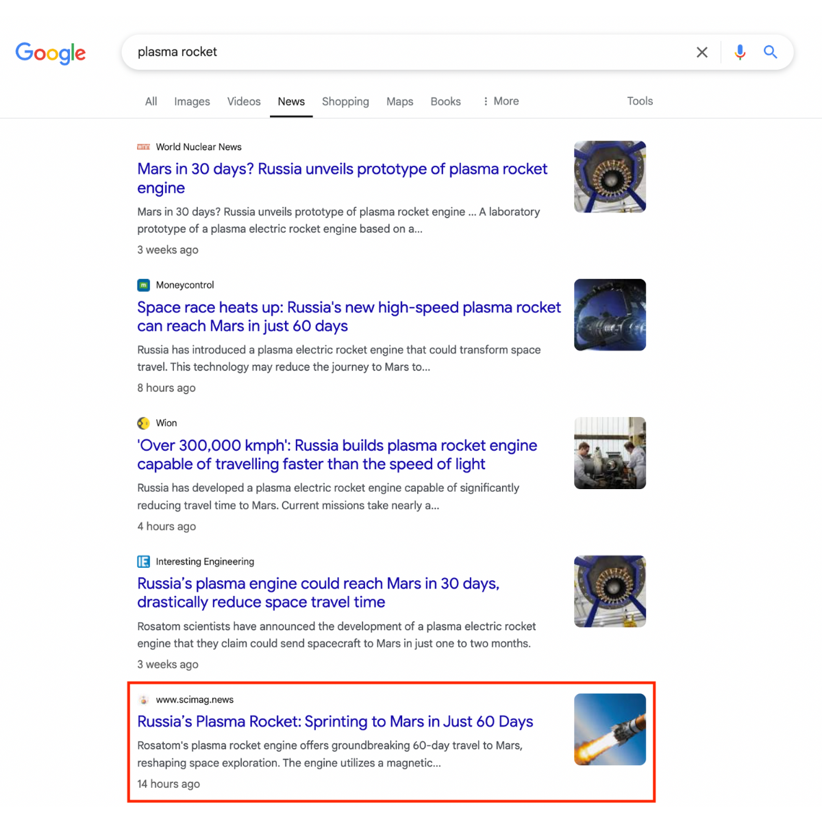 Yet another search, this one for “plasma rocket,” also returned a Science Magazine-generated story in the top results under the News tab, showcasing another faux image of an alleged spacecraft.