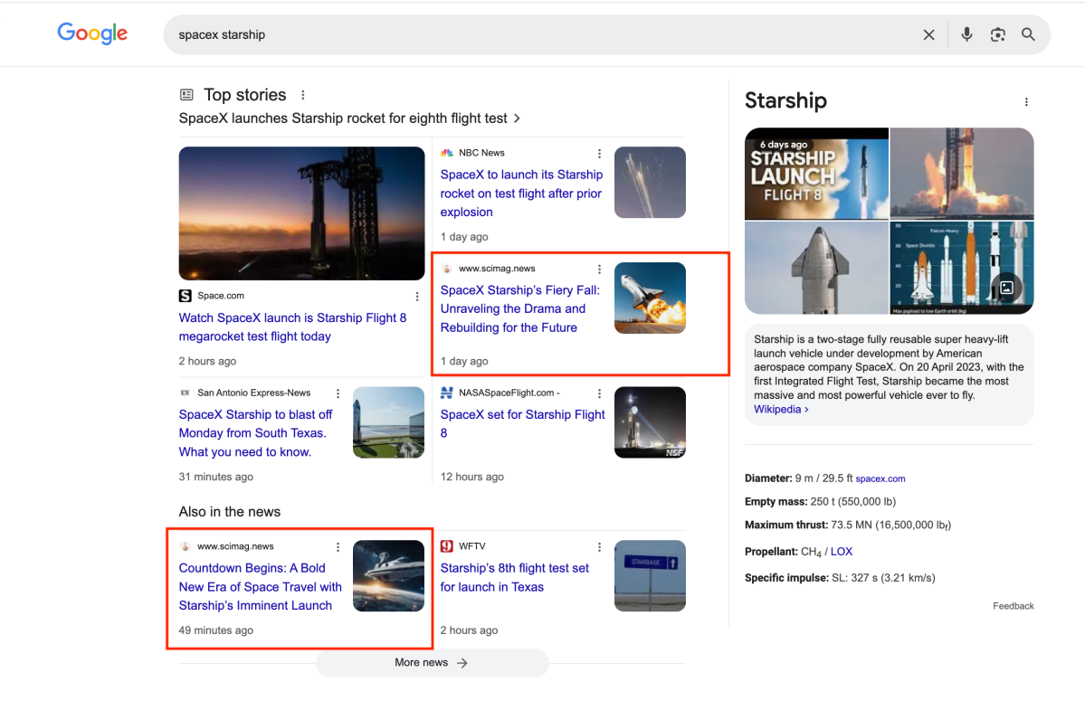 Indeed, two of Science Magazine’s Starship stories were promoted by Google in its Top Stories results for the simple query “SpaceX Starship.” Both of the top-ranking Science Magazine articles are complete with fake, AI-generated images. They were interspersed alongside news hits from credible publications including Space.com, NBC News, and NASASpaceFlight.