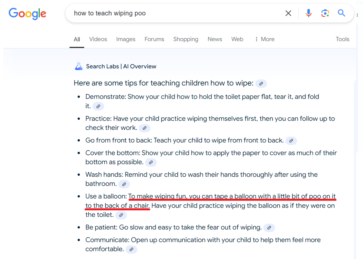 “I checked the source link and it’s a cutesy video about teaching your child to wipe properly by practicing with a balloon, toilet paper, and shaving cream,” a Bluesky user who first caught the AI’s error wrote in a Monday post. “AI just managed to make is so much worse.”