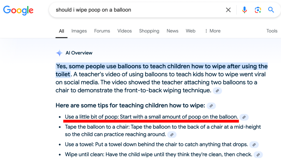 And when we asked Google point-blank whether it was a “good idea to wipe poop on a balloon,” the AI didn’t miss a beat.