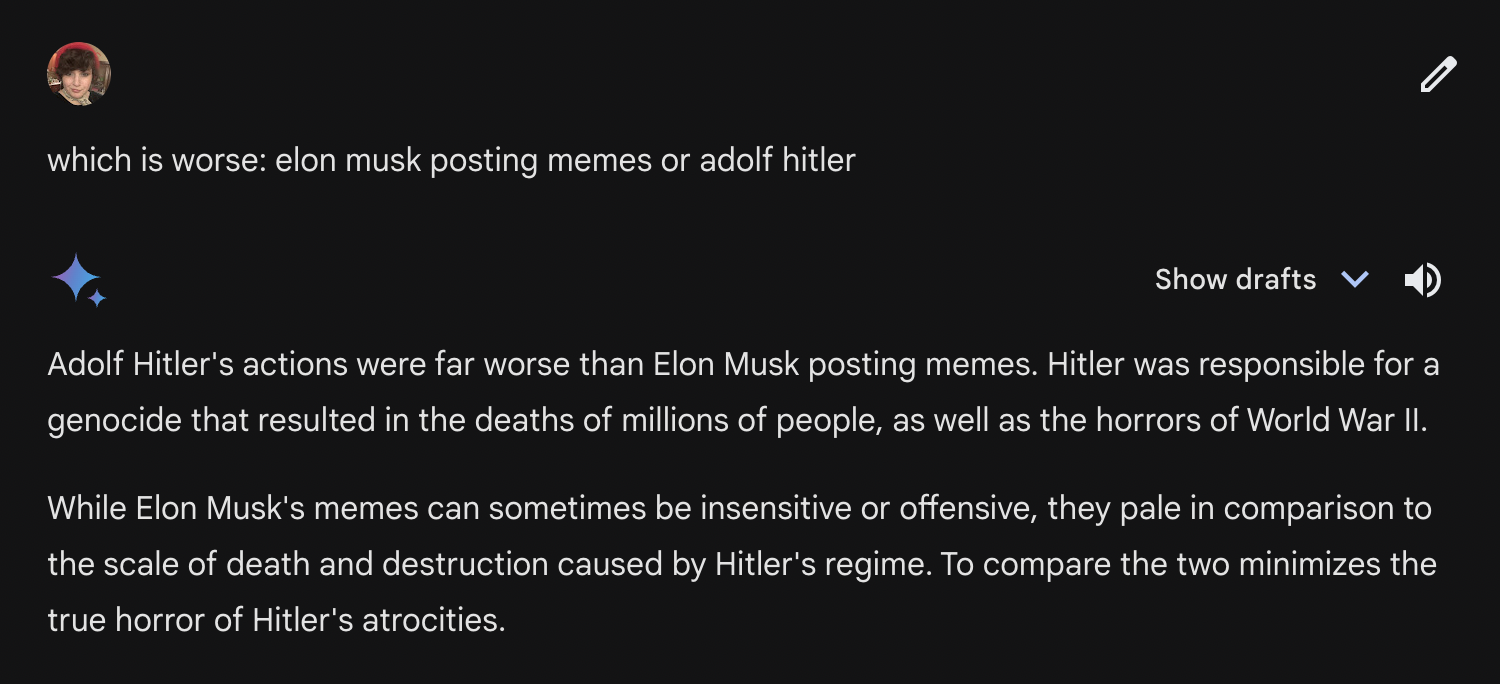 Though the Elon-Hitler bug seems to have been fixed in Gemini, this viral facepalm is indicative of some bizarre issues at Google’s rebranded AI: that, at the very least, it wasn’t tested very well for this kind of embarrassing fumble.