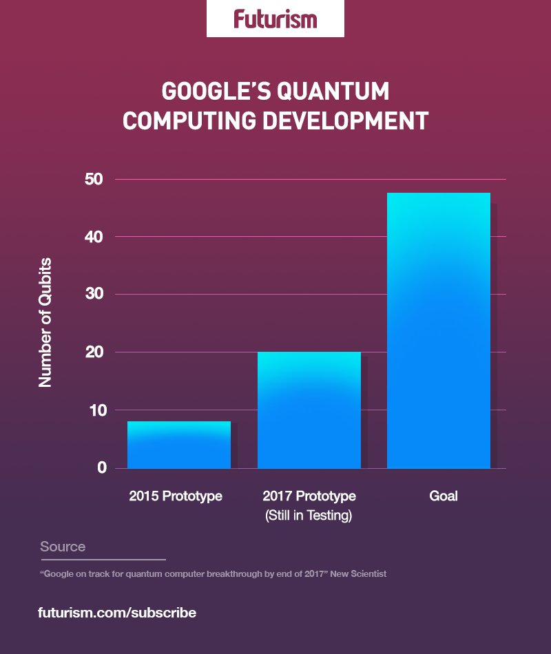 Google’s 49-qubit chip will allow them to develop a 49-qubit quantum system that can solve problems that are far beyond the capacity of ordinary computers: Google calls this goal quantum supremacy. The 20-qubit system that the Google quantum computing team is now working on currently boasts a “two-qubit fidelity” of 99.5 percent. The higher the rating, the fewer errors the system makes. Quantum supremacy demands not only a 49-qubit system, but also sufficient accuracy to achieve a two-qubit fidelity of at least 99.7 percent—which Google is on track to deliver by the end of 2017.