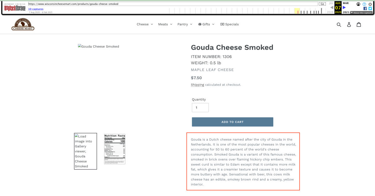 As the Verge first reported, though the Google ad is crafted in a way that seemingly shows Gemini generating entirely new web copy for the business to use, archived versions of the cheese mart’s website show that the Wisconsin business has been using the exact same product description since at least 2020.
