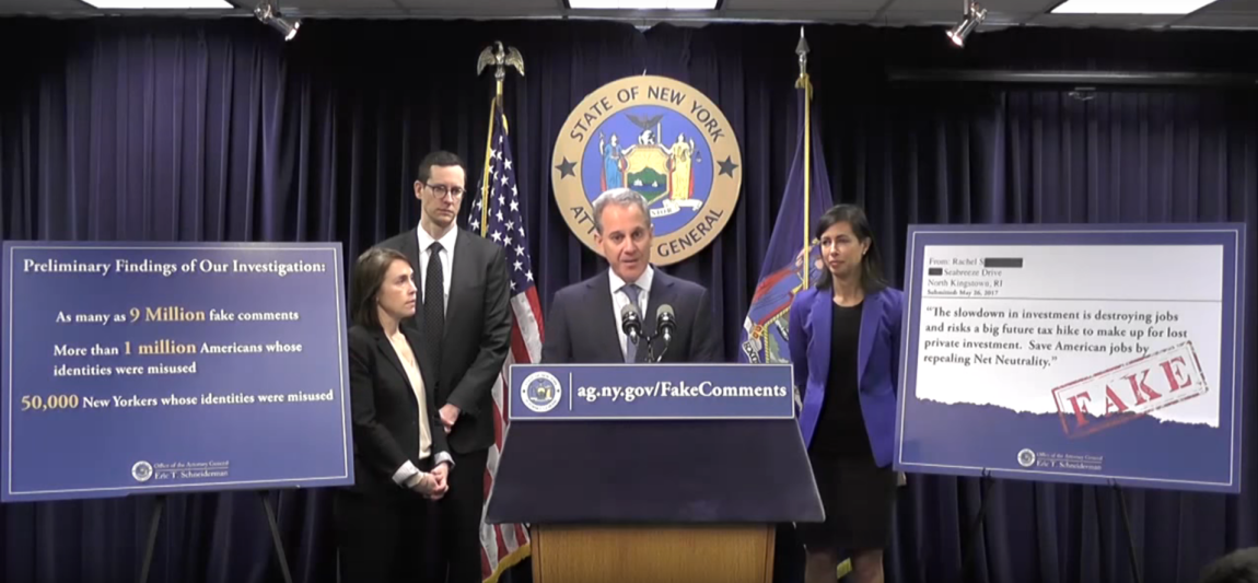 As reported by Schneiderman, a Broadband for the America-funded study found that nearly 8 million comments on the repeal were submitted using either temporary or disposable email addresses, and roughly 10 million used duplicate email and home addresses. These were taken as obvious signs of foul play, which ultimately led Schneiderman to conclude that over 1 million Americans’ identities were used to submit false comments in favor of the repeal. Rachel Shippee, Schneiderman’s office’s assistant press secretary, was among the identities taken.