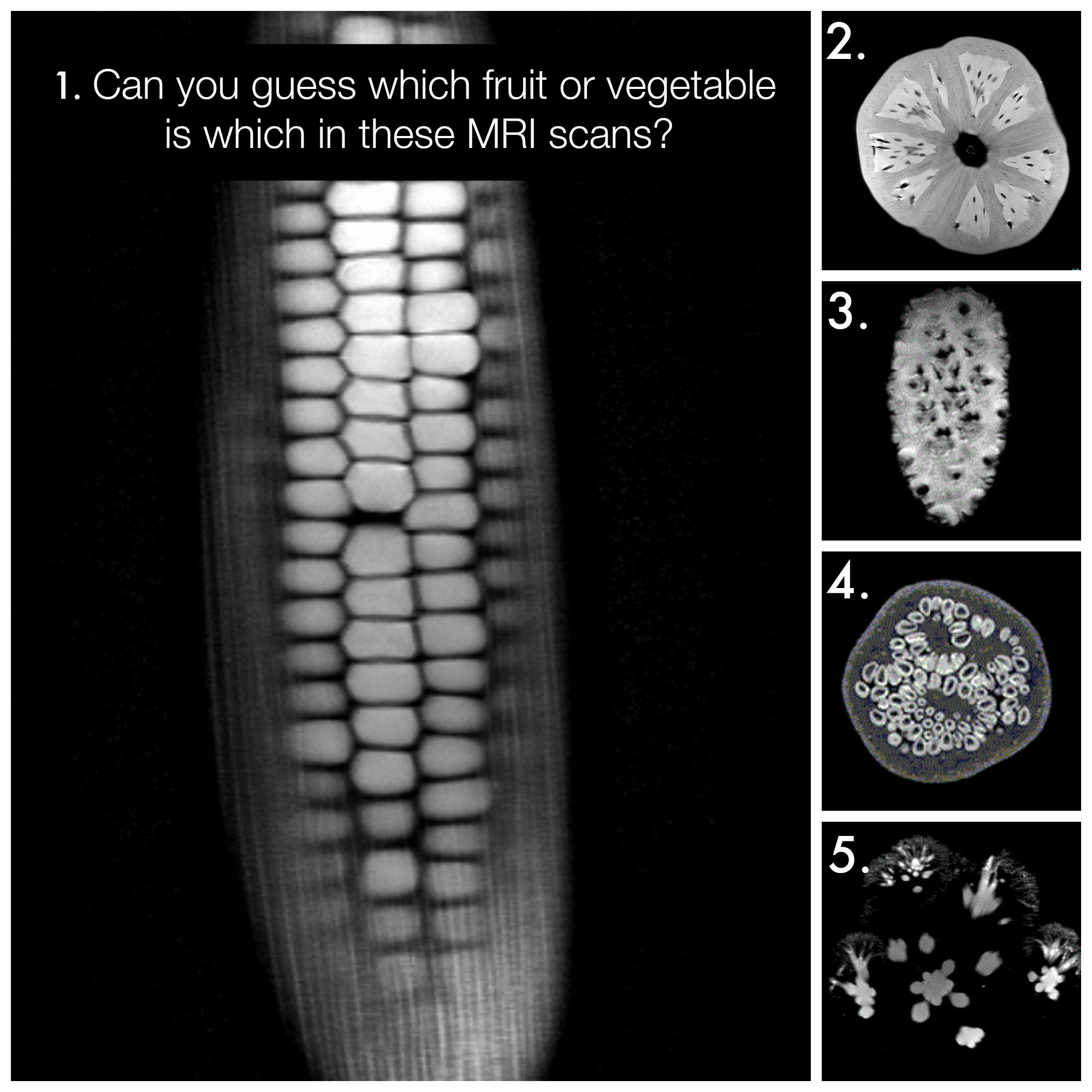Below, we have 20 MRI scans of various fruits and vegetables. Can you guess what the food is from the MRI? Answers are listed below.