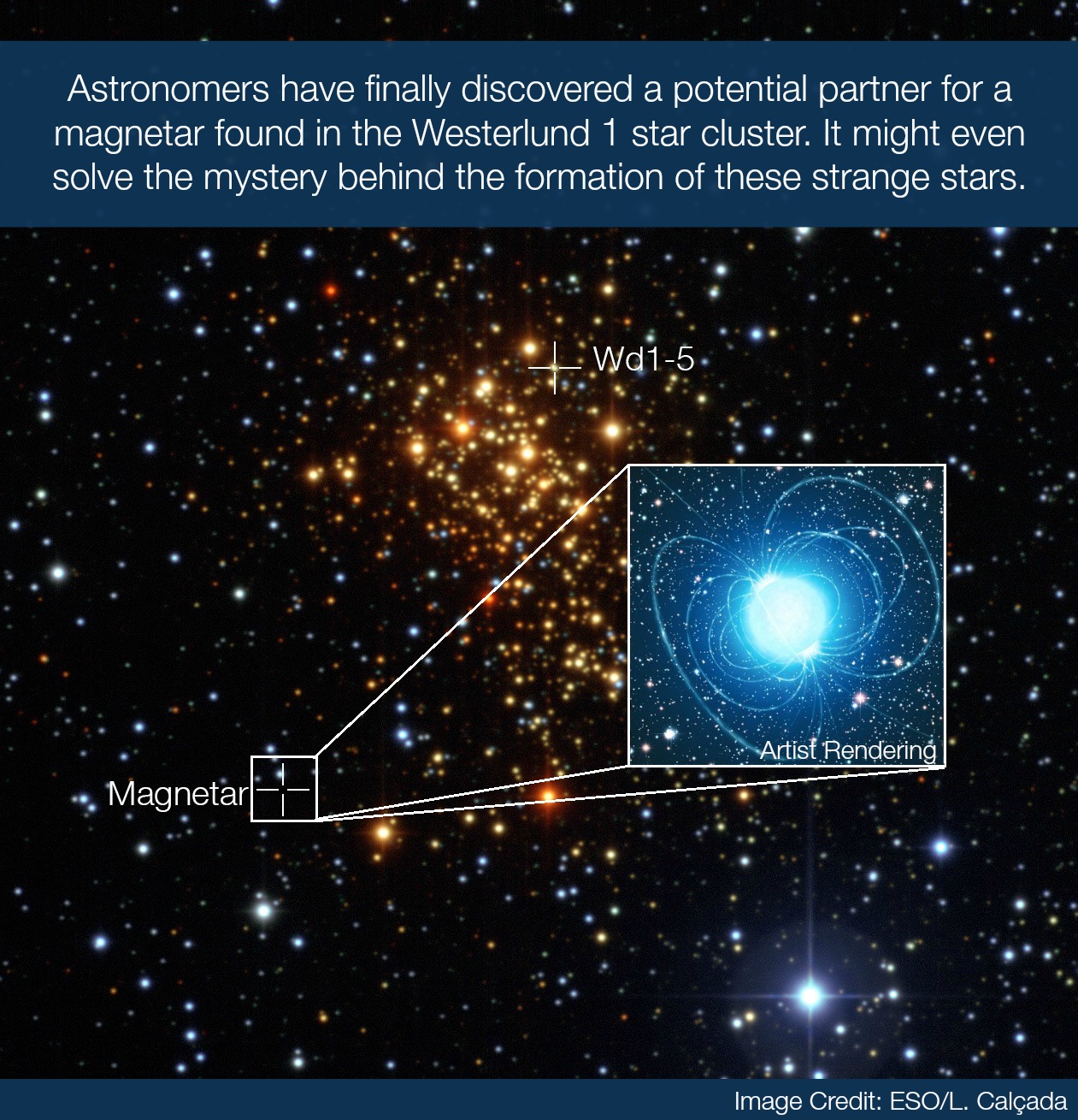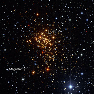 While looking at a star cluster known to contain one of these peculiar objects, dubbed CXOU J164710.2-455216 (for the sake of brevity, we’ll call it CXOU), they were finally able to suss out a potential companion star. The star, called Westerlund 1-5, is named after the region it calls home: the Westerlund 1 star cluster (the whole lot of it can be found about 16,000 light-years from Earth in the Ara constellation).