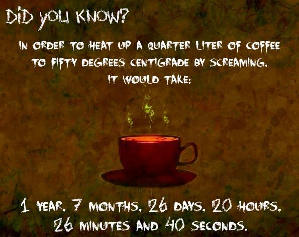 “Sound carries a relatively low amount of energy while warming up a cup of coffee an appreciable amount takes much more. The average human yells at about 80 decibels, which carries along with it about .001 watts of energy, about a 100,000 times less than the energy needed to light a standard 100 watt bulb. If you were to focus this energy at the average 8 oz cup of coffee (we’ll round up to .25 liters to make calculations easier) the average yell lasting a single second would warm the cup of coffee .00000095 degrees Celsius.